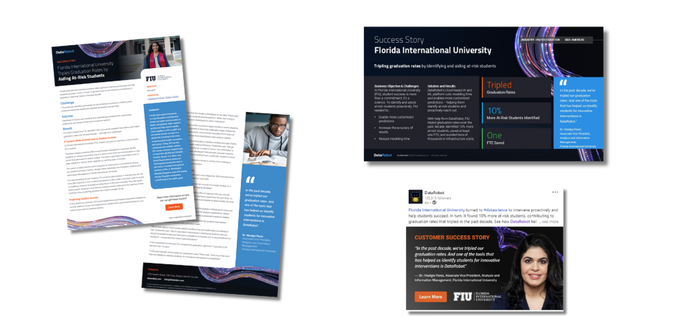 The full customer-story packet included: strategic interviewing, a customer story, a sales slide, and social media teaser copy featuring DataRobot's work with Florida International University.